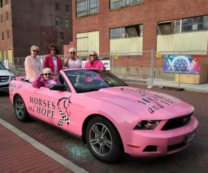 Five local women from the Meade County Breast/Ovarian Support Group went to the Party in Pink at Old Forester’s Paristown in Louisville Monday night. They saw old friends and made new ones. Rachel Platt was master of ceremonies. There was a nice stage there and Layla Spring, an American Idol contestant and her little sister performed. They had a great meal catered by The Café next door. Here they all are in the Horses and Hope Pink Mustang with their pink sunglasses on! Left to right: Donna Felmy, Charlotte Medley, Janet Hobbs, Bonita Finch, Bev Morrison